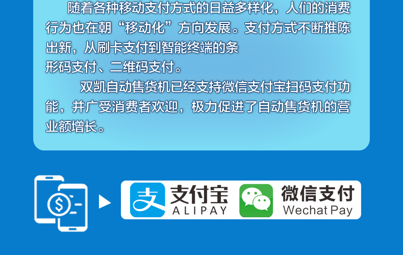 雙凱自動售貨機已經(jīng)支持微信支付寶掃碼支付功能,并廣受消費者歡迎,極力促進了自動售貨機的營業(yè)額增長。